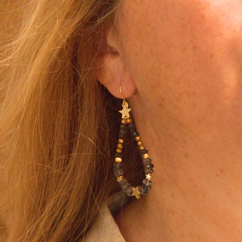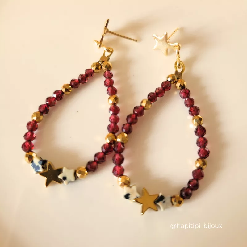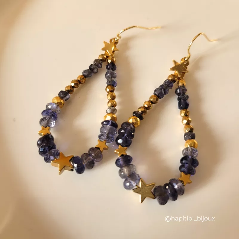 Composition : Etoile et perle en pierre naturelle facettée, perle en Hématite plaquée or 18k, Puce étoile en acier inoxydable plaquée or 18k. Taille des perles 3 mm.