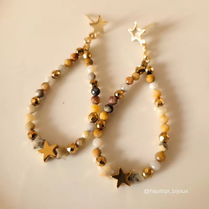 Boucles CELESTE, composées de perles en Etoile ou facettée en pierre naturelle et en hématite plaquées or pour apporter de la brillance et de l’élégance. Chaque pierre est unique et en fait un bijou exceptionnel rien que pour TOI. Ces boucles, faciles à vivre, lumineuse et élégante, se portent au quotidien. A adopter pour Briller !