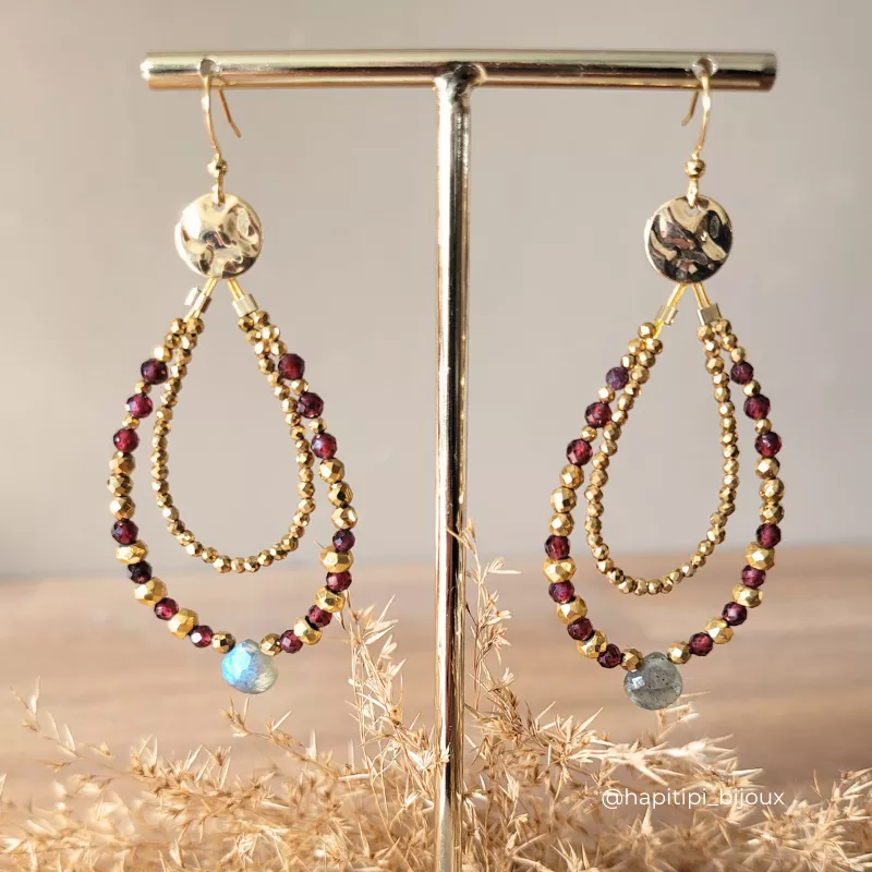 Composition : Perle pierre naturelle, perle en Hématite plaquée or 18k, goutte en Améthyste verte ou Labradorite, Crochet en acier inoxydable plaqué or 18k. Taille des perles 3 mm.