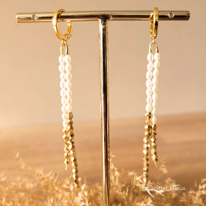 Boucles DIVINE, composées de perles en pierre naturelle et de perles en verre facetté plaqués or pour apporter de la brillance et de l’élégance. Chaque pierre est unique et en fait un bijou exceptionnel rien que pour TOI. Ces boucles, facile à vivre, lumineuse et élégante, se portent au quotidien. A adopter pour Briller !