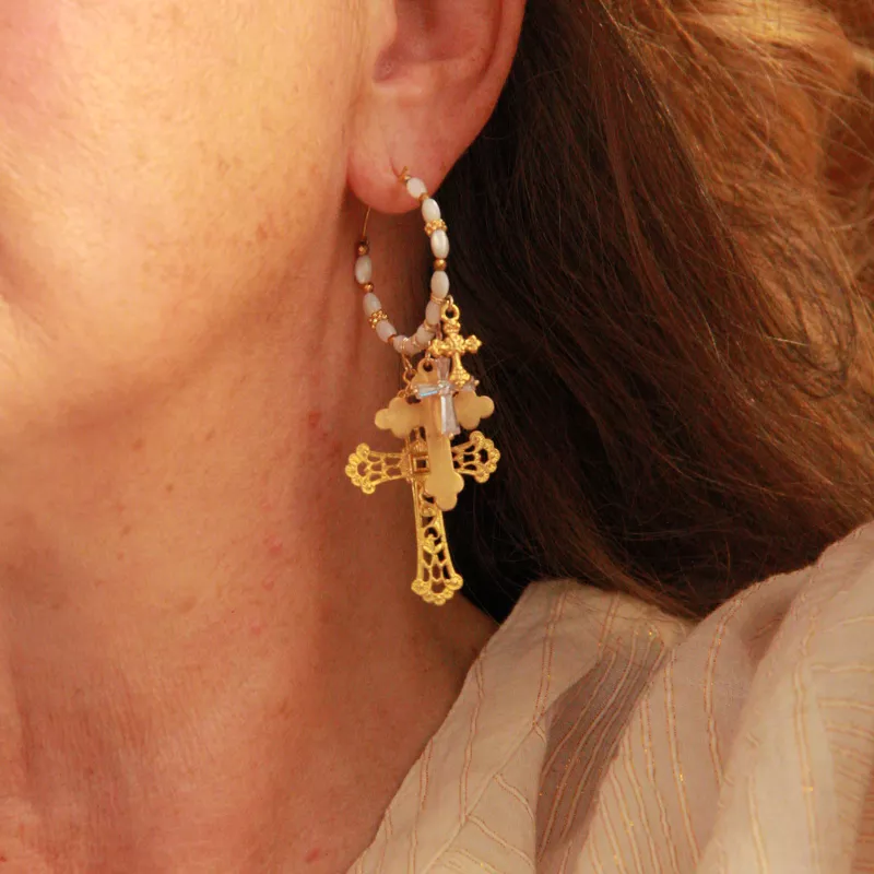 Boucles SACRE, composées de perles en nacre naturelles et acier inoxydable plaquées or, accompagnées de plusieurs croix plaquées or pour apporter de la brillance et de l’élégance. Chaque pierre est unique et en fait un bijou exceptionnel rien que pour TOI. Ces boucles, faciles à vivre, lumineuse et élégante, se portent au quotidien. A adopter pour Briller !
