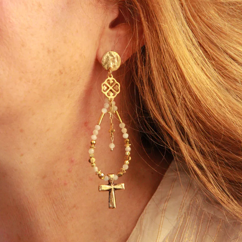 Composition : Perle en nacre naturelle facettée, perle en hématite plaquée or 18k, perle en acier inoxydable plaquée or 18k, croix en laiton antique, clou d’oreille en acier inoxydable plaquée or 18k. Taille des perles 3 mm.