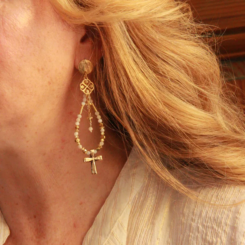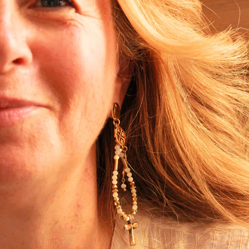 Boucles SACRE XL, composées de perles en nacres facettées, de perles dorées, accompagnées d’une jolie croix pour apporter de la brillance et de l’élégance. Chaque pierre est unique et en fait un bijou exceptionnel rien que pour TOI. Ces boucles, faciles à vivre, lumineuse et élégante, se portent au quotidien. A adopter pour Briller !