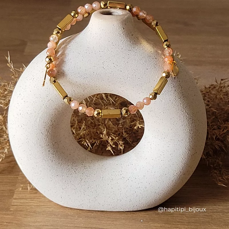 Composition : Perle en pierre naturelle facettée, perle en hématite et acier inoxydable plaquée or 18k, fil à mémoire de forme en acier inoxydable plaqué or 18k. Taille des pierres 4 mm.