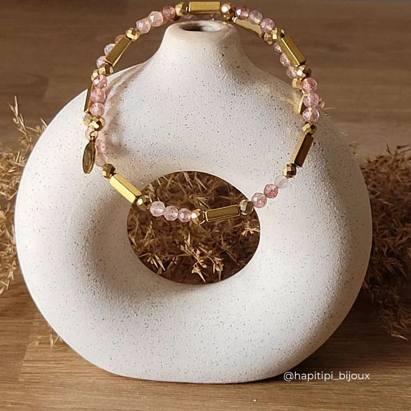 Bracelet CONSTANCE, composé de perles en hématite et pierre naturelle facettée et de perles en acier inoxydable plaquées or, pour apporter brillance et élégance à ce bracelet simple mais féminin. Chaque pierre est unique et en fait un bijou exceptionnel rien que pour TOI. Lumineux et élégant, ce bracelet est facile à vivre, il se porte au quotidien. Monté sur un fil à mémoire de forme il se met et s’enlève rapidement. A adopter pour Briller !