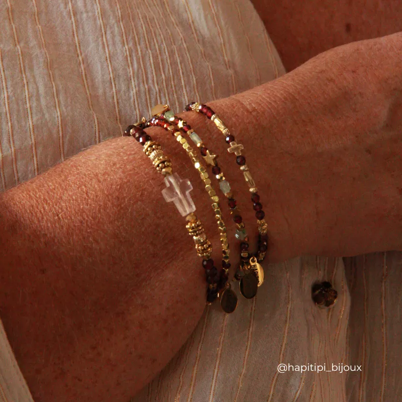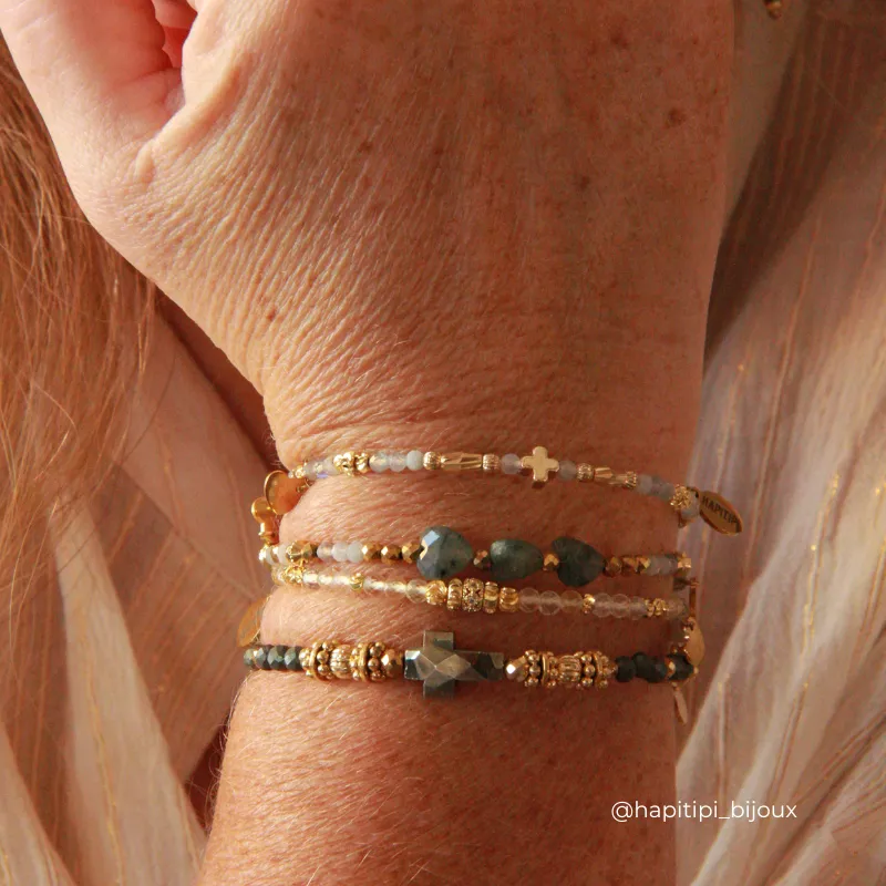 Bracelet FUSION, composé d’une belle croix et de perles en pierre naturelle facettées, de perles en acier inoxydable plaquées or, pour apporter brillance et élégance. Chaque pierre est unique et en fait un bijou exceptionnel rien que pour TOI.  Lumineux et élégant, ce bracelet est facile à vivre, il se porte au quotidien. Monté sur un fil à mémoire de forme il se met et s’enlève rapidement. A adopter pour Briller !
