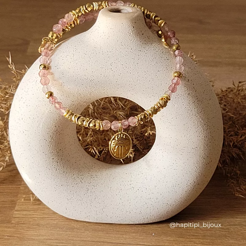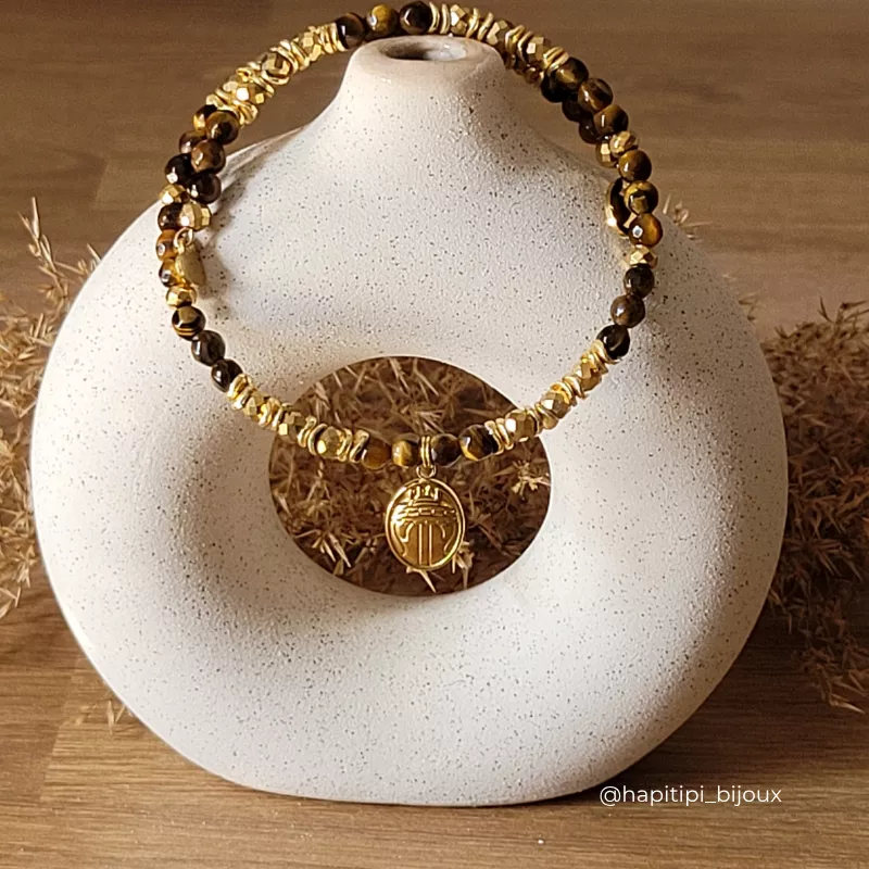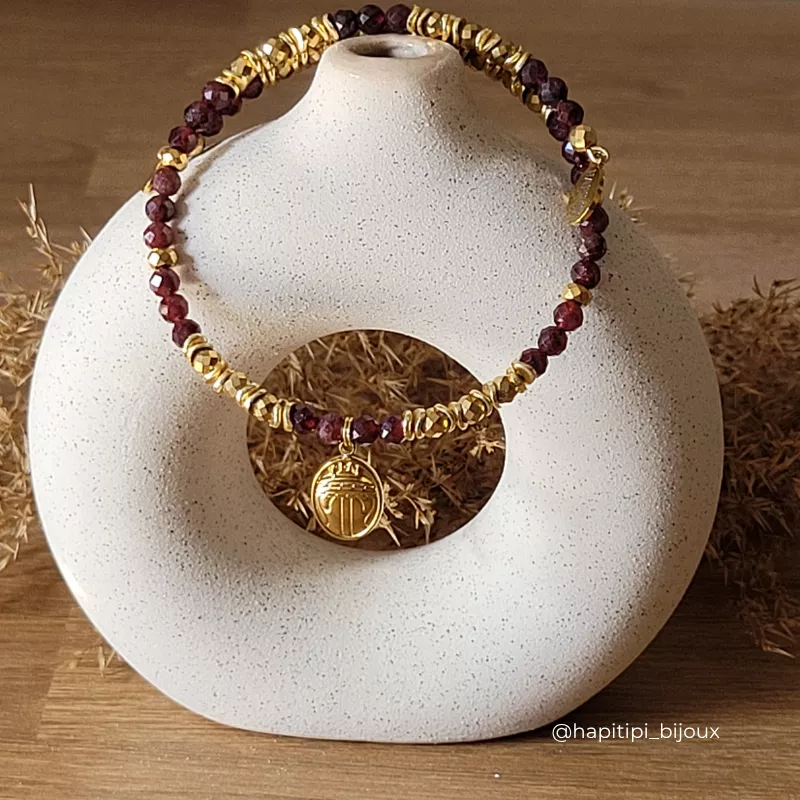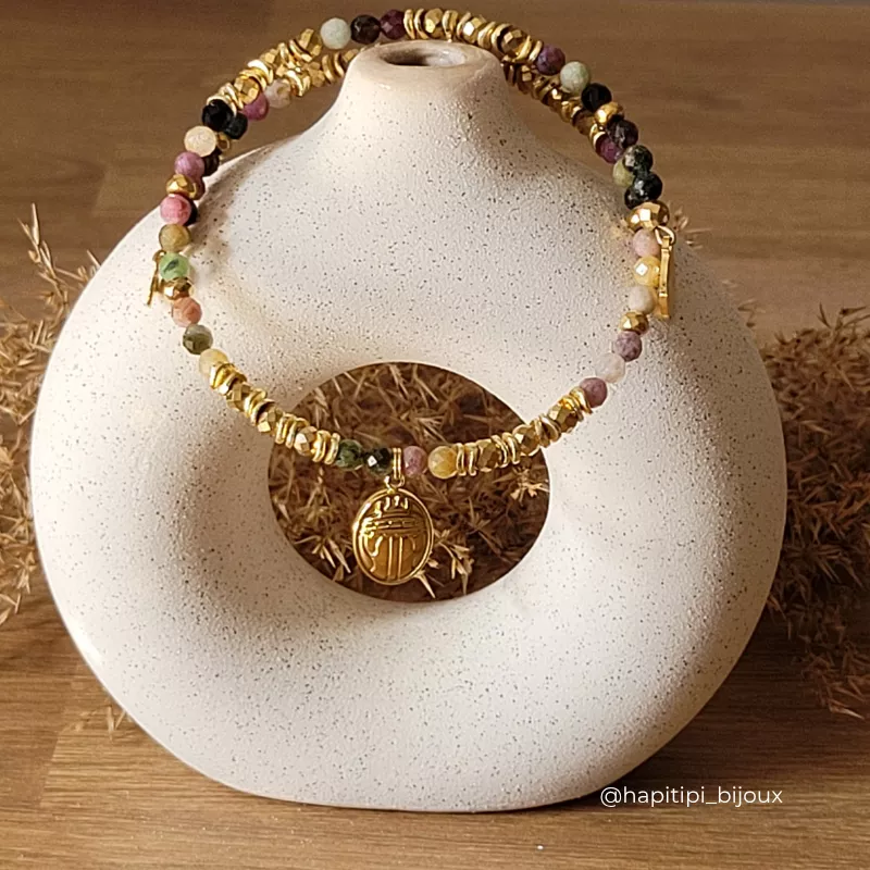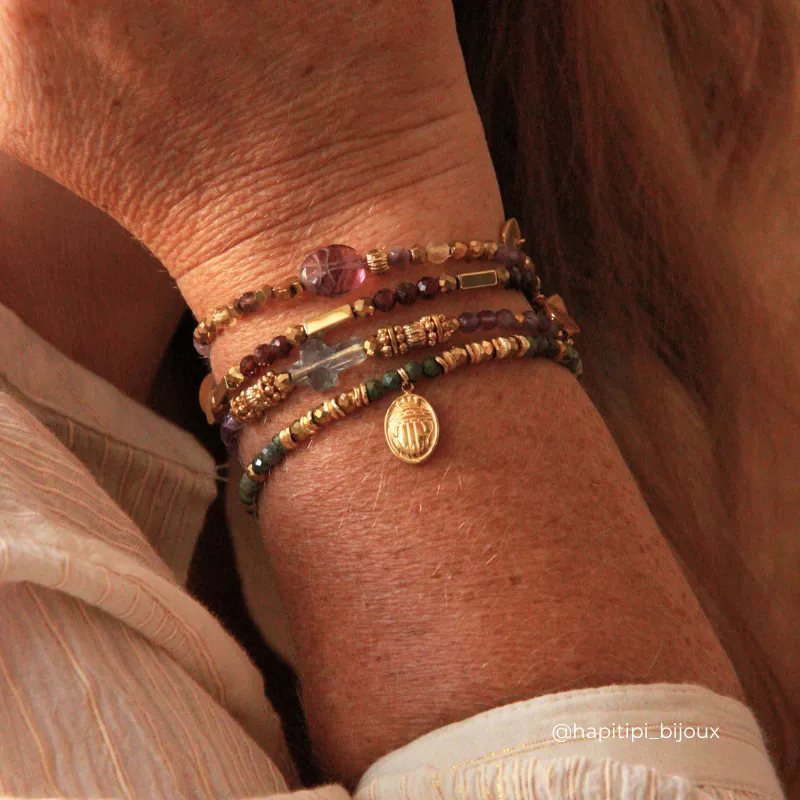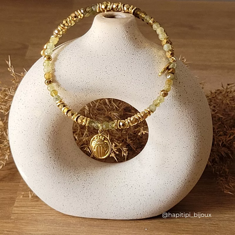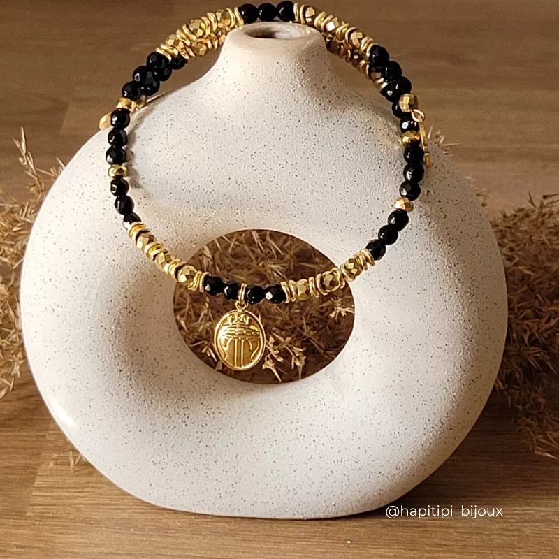 Composition : Breloque scarabée en acier inoxydable plaquée or 18k, perle en pierre naturelle facettée, perle en hématite et acier inoxydable plaquée or 18k, fil à mémoire de forme en acier inoxydable plaqué or 18k. Taille des pierres 4 mm.