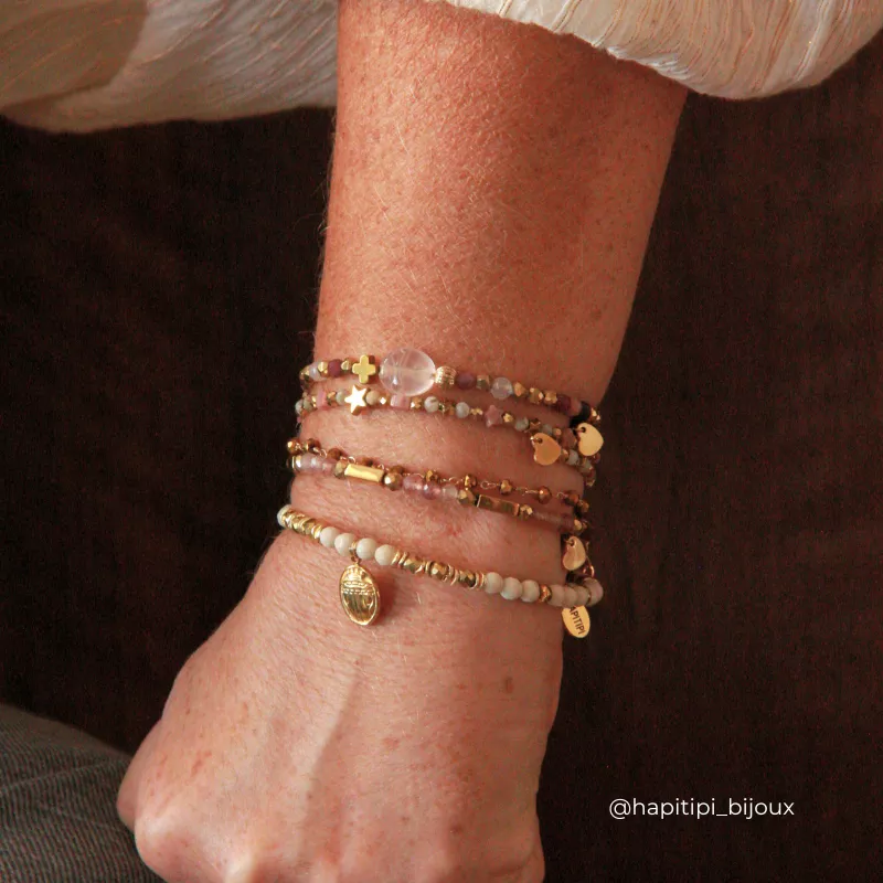 Bracelet SCARABEE, composé d’une breloque scarabée en acier inoxydable, de perles en pierre naturelle et de perles en acier inoxydable plaquées or, pour apporter brillance et élégance. Chaque pierre est unique et en fait un bijou exceptionnel rien que pour TOI. Lumineux et élégant, ce bracelet est facile à vivre, il se porte au quotidien. Monté sur un fil à mémoire de forme il se met et s’enlève rapidement. A adopter pour Briller !