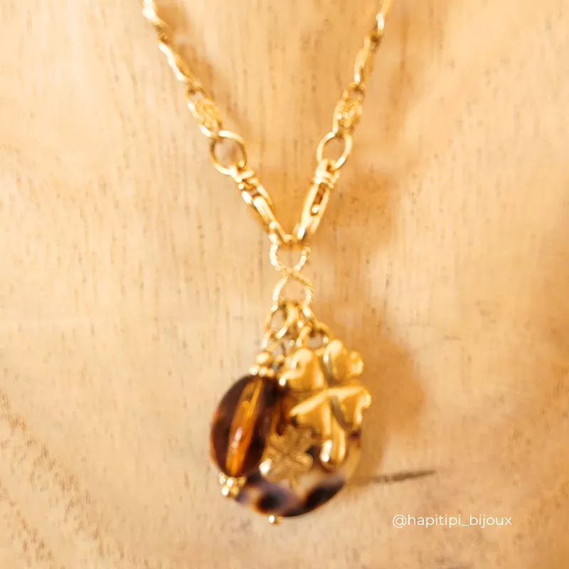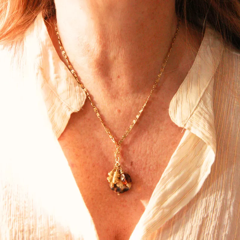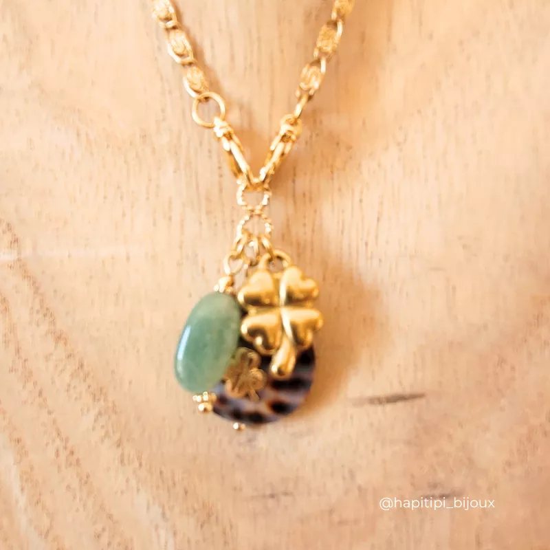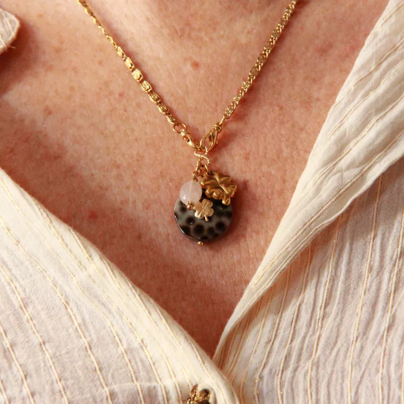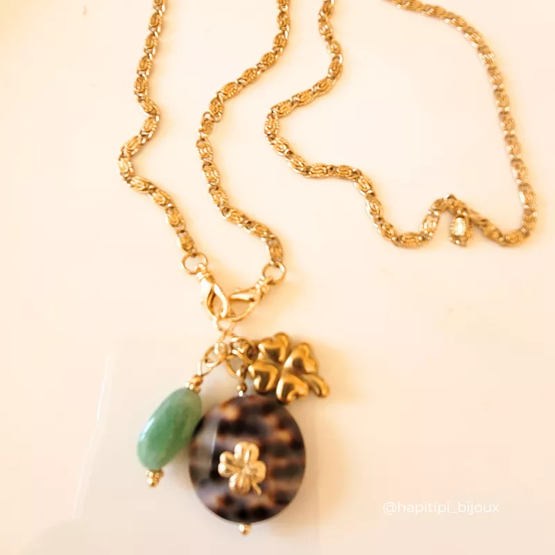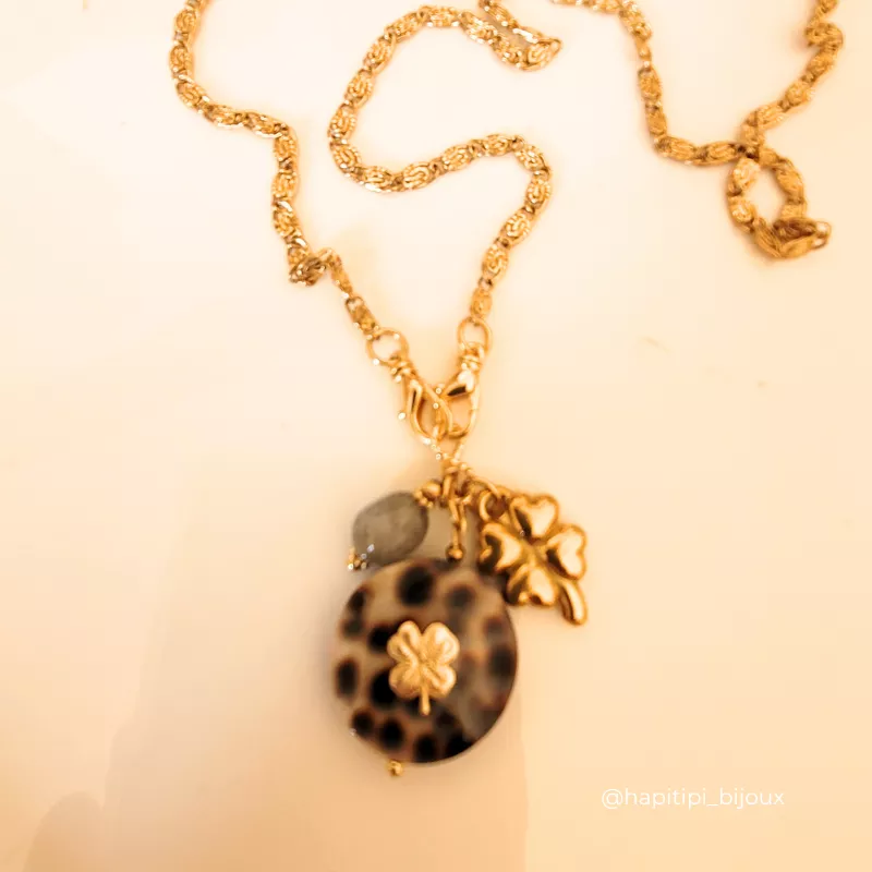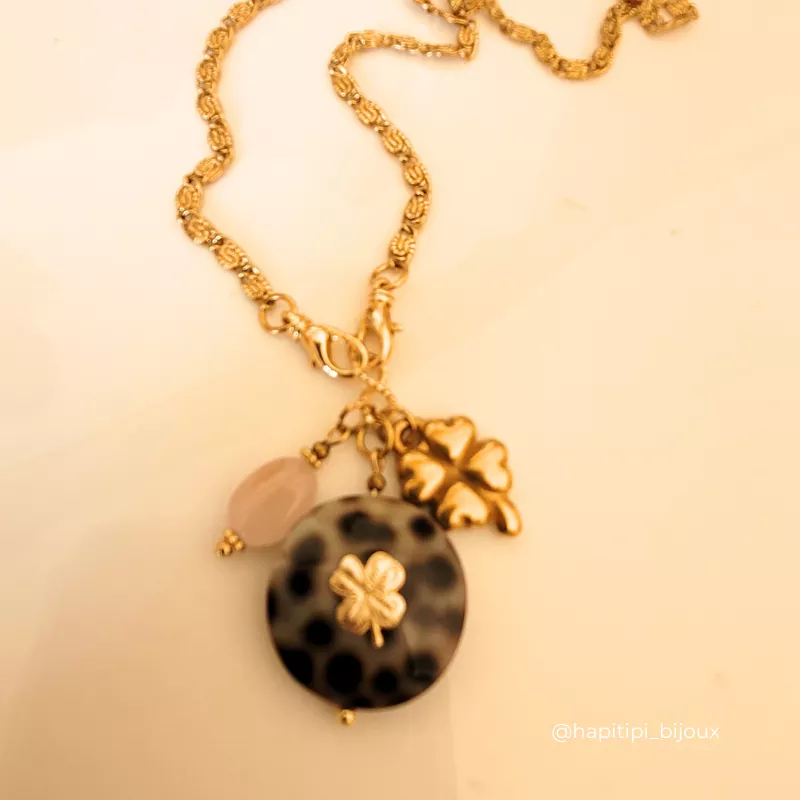 Collier LEO, composé d’un gros coquillage léopard avec un trèfle accompagné d’un second trèfle en acier inoxydable et une pierre naturelle, pour te porter doublement chance et pour apporter brillance et élégance. Chaque pierre est unique et en fait un bijou exceptionnel rien que pour TOI.  Lumineux et élégant, ce collier est facile à vivre, il se porte au quotidien, peut se cumuler avec tes autres colliers pour un style plus moderne. A adopter pour Briller !