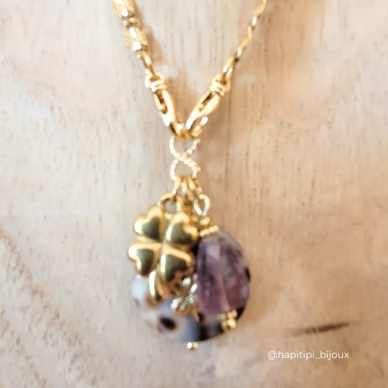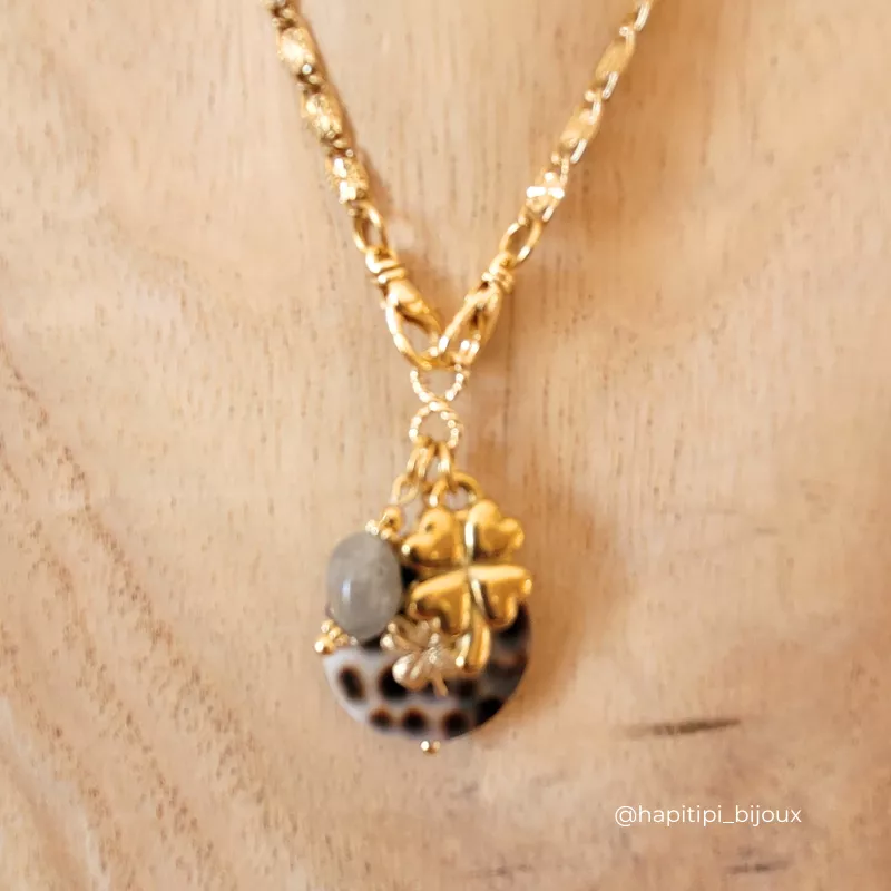 Composition : Coquillage Léopard naturelle avec trèfle en Goldfilled, perle en pierre naturelle, perle, fermoir et chaîne en acier inoxydable plaquée or 18k. Longueur  env. 50 cm.