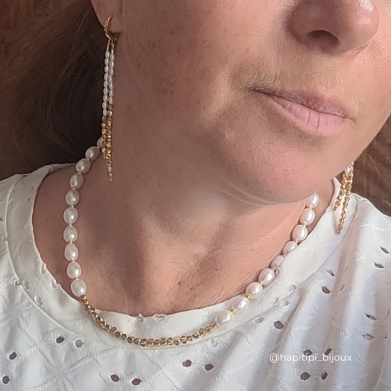 Collier NAMASTE XXL, la version du collier de perle revisitée, composé de perles d’eau douce naturelles en version XXL, accompagné de perles dorées pour la brillance. Chaque pierre est unique et en fait un bijou exceptionnel rien que pour TOI. Lumineux et élégant, ce collier est facile à vivre, il se porte au quotidien. A adopter pour Briller !