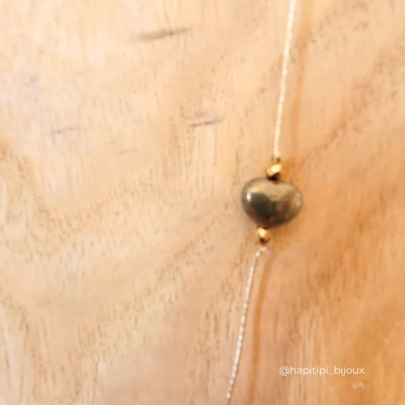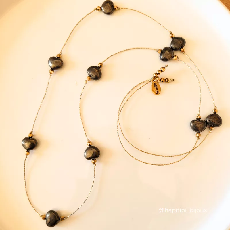 Sautoir NOA, composé de perles coeur en pyrite, accompagné d’hématites dorées pour encore plus d’élégance et de brillance. Un collier pour un max d’abondance dans ta vie. Chaque pierre est unique et en fait un bijou exceptionnel rien que pour TOI.  Lumineux et élégant, ce collier est facile à vivre, il se porte au quotidien. A adopter pour Briller !