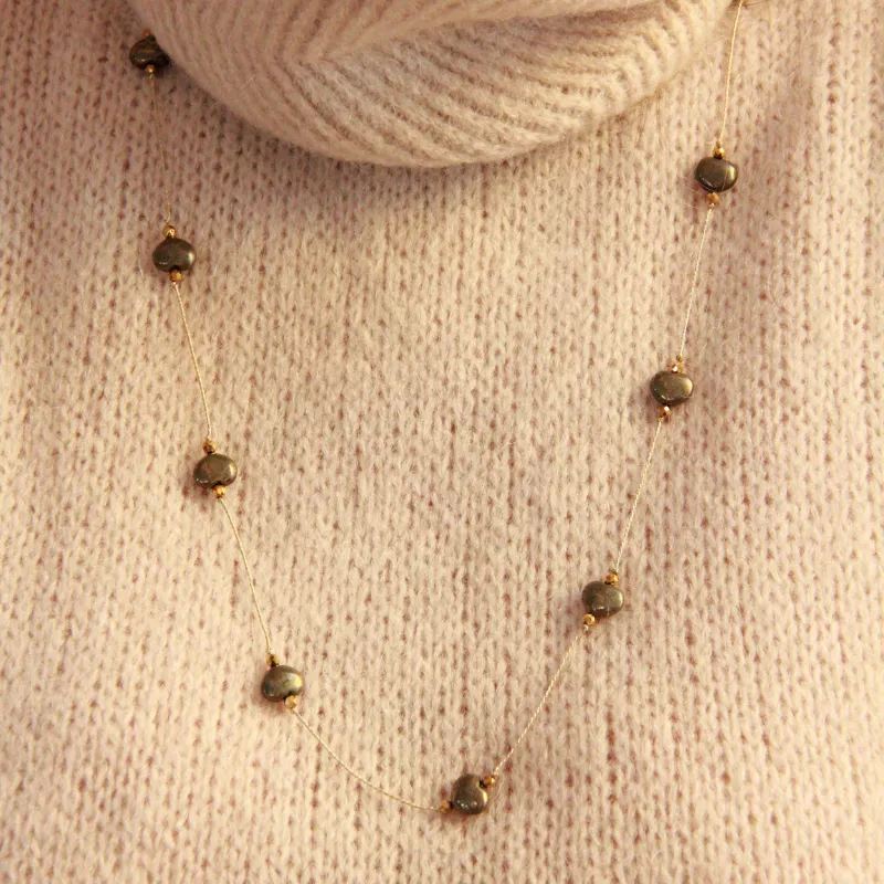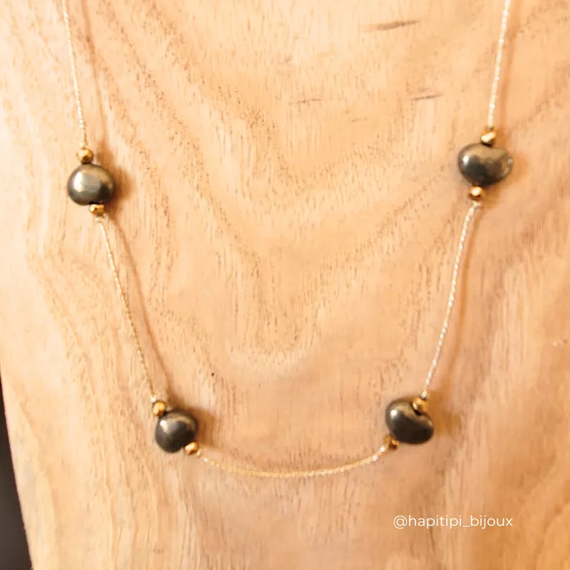Composition : Perles coeur pyrite naturelle, perle en acier inoxydable plaquée or 18k. Longueur 74 cm. Taille des perles 8 mm.