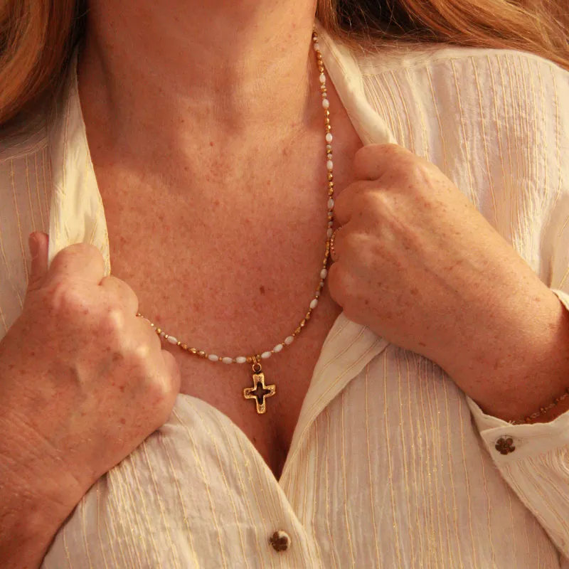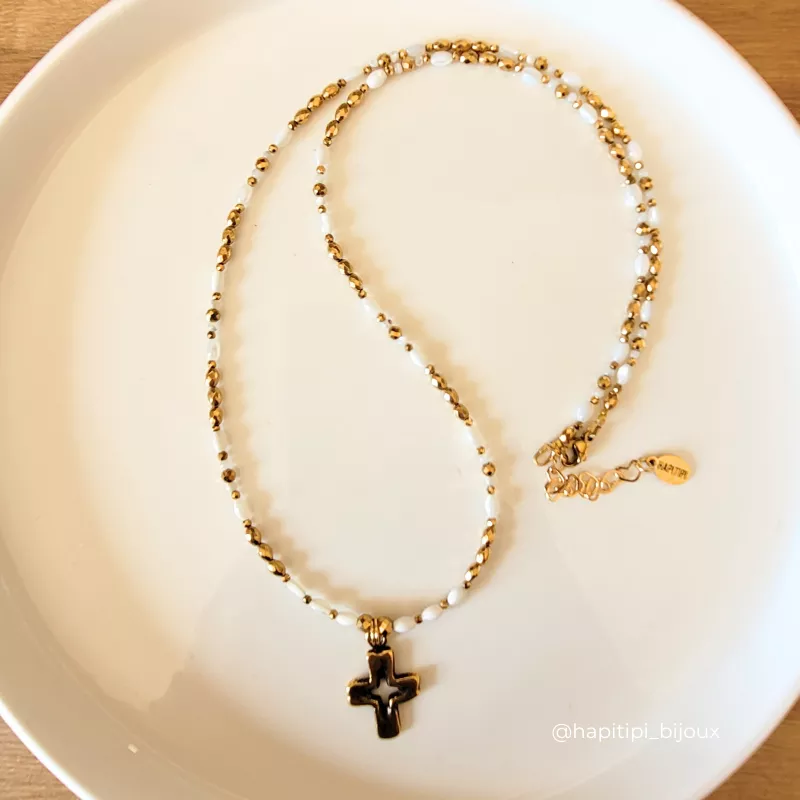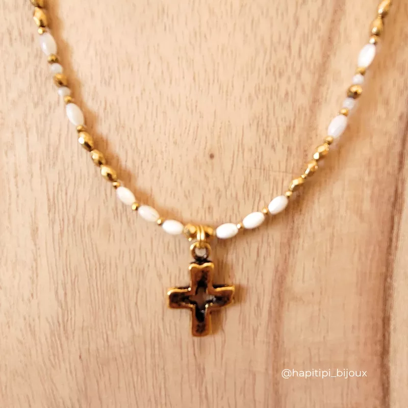 Composition : Croix en laiton antique, perle nacre naturelle, perle hématite facettée plaquées or 18k, perle en acier inoxydable plaquée or 18k. Taille croix 2 cm. Longueur 60 cm + Chaîne extension de 5 cm.