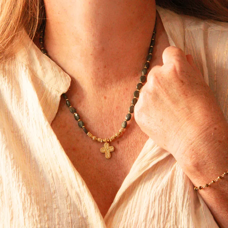 Collier SACRE, composé de perles facettées en pyrite, accompagné d’une jolie croix et de perles dorées pour encore plus d’élégance et de brillance. Un collier pour un max d’abondance dans ta vie. Chaque pierre est unique et en fait un bijou exceptionnel rien que pour TOI. Lumineux et élégant, ce collier est facile à vivre, il se porte au quotidien. A adopter pour Briller !