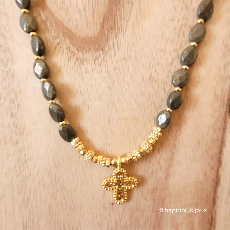 Composition : Perle pyrite naturelle facettée, croix et perle en acier inoxydable plaquée or 18k. Taille des perles 8 mm, croix 2 cm. Longueur 51 cm + Chaîne extension de 5 cm.